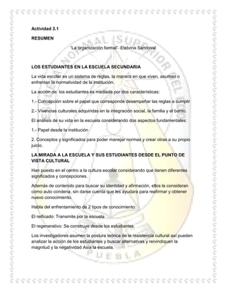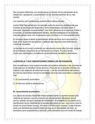 Este documento resume las perspectivas y experiencias de los estudiantes en la escuela secundaria. Explora cómo los estudiantes se adaptan a las nuevas normas y roles, y cómo desarrollan su identidad dentro de la escuela y su grupo. También examina las concepciones de la escuela sobre los estudiantes y los saberes que estos van adquiriendo, así como los significados que le atribuyen a la educación secundaria.