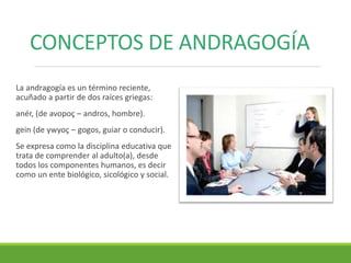 La andragogía se refiere a la educación de adultos y se basa en principios como que los adultos son autodirigidos, aprenden de su experiencia, y están internamente motivados a aprender. La pedagogía se refiere a la educación de niños y jóvenes y se centra en el maestro transmitiendo información a estudiantes pasivos. Mientras la andragogía promueve la comunicación horizontal y la autogestión, la pedagogía implica una comunicación vertical del maestro al estudiante.