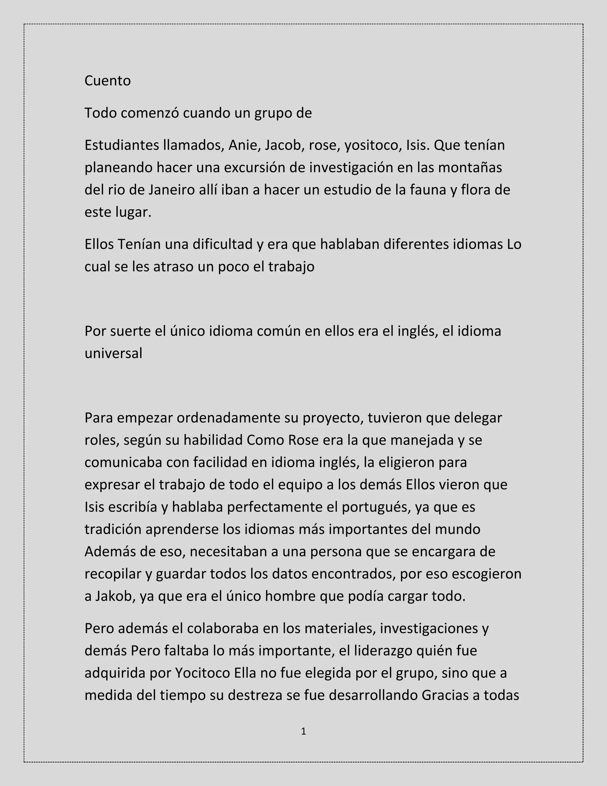 Un grupo de estudiantes de diferentes países planea una excursión para estudiar la flora y fauna de las montañas de Río de Janeiro. Debido a que hablan diferentes idiomas, eligen roles basados en sus habilidades lingüísticas para trabajar de manera efectiva, con Rose como portavoz en inglés y Isis como experta en portugués. A pesar de algunas discusiones iniciales, aprenden a resolver problemas colaborando y completan con éxito su proyecto.