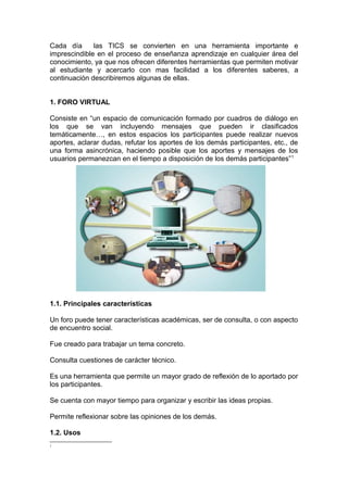 El documento describe diferentes herramientas tecnológicas para la educación continua como foros virtuales, chat, audio conferencia, correo electrónico y videoconferencia. Luego propone usar estas herramientas para que estudiantes analicen problemas matemáticos de la vida cotidiana de forma individual y grupal. Algunas aplicaciones incluyen usar el chat para debatir soluciones y el correo electrónico para compartir procesos; crear un cuaderno digital en un foro y olimpiadas matemáticas por videoconferencia.