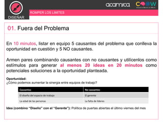 El documento describe un ejercicio colaborativo para generar ideas innovadoras mediante la identificación de causas de un problema y su contraste con factores no causantes. Se sugiere listar en equipo cinco causantes y cinco no causantes, y combinarlos para inspirar al menos 20 soluciones sobre cómo aumentar la sinergia entre los equipos de trabajo. Un ejemplo de idea es implementar una política de puertas abiertas el último viernes del mes.