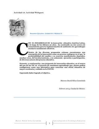 Este documento presenta una propuesta de innovación educativa en la ENCCH que busca mejorar el uso de las TIC en el proceso de enseñanza-aprendizaje. Actualmente, a pesar de contar con infraestructura tecnológica, docentes y estudiantes no la utilizan en actividades académicas. La propuesta busca que las TIC se utilicen para promover la creatividad de los estudiantes, en línea con el modelo educativo de la ENCCH. El problema principal es la resistencia al cambio y el desconocimiento sobre las TIC