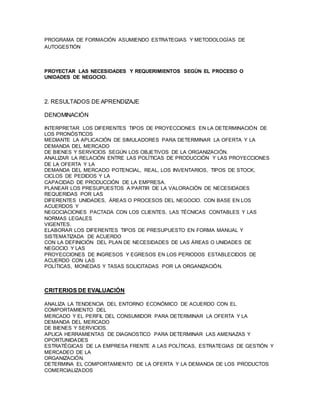 El documento describe las competencias y resultados de aprendizaje requeridos para un puesto relacionado con la logística y la cadena de suministro. Entre las competencias clave se encuentran evaluar procesos según indicadores, formular planes estratégicos de logística, y costear la cadena de suministro. Los resultados de aprendizaje incluyen interpretar proyecciones para pronósticos, analizar la relación entre producción y demanda, y elaborar presupuestos.