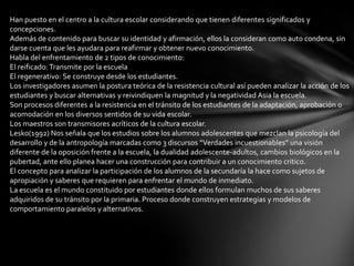 La escuela y sus concepciones sobre los estudiantes se centran en dos aspectos: 1) El conocimiento acumulativo, donde los planes de estudio mantienen una gran cantidad de materias que generan una sobrecarga de trabajo para los estudiantes. 2) El discurso sobre la adolescencia, que generaliza las características de los estudiantes sin considerar su contexto. Los estudiantes desarrollan estrategias alternativas para enfrentar estas concepciones, apropianado saberes que les permiten integrarse a la escuela y formar su identidad.