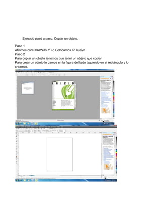 Este documento presenta un resumen paso a paso sobre cómo copiar un objeto en el programa CoreDRAWX5. Explica crear primero un objeto original como un rectángulo y luego seleccionarlo para copiarlo usando las teclas Ctrl+c. Finalmente, pegar la copia en otra ubicación usando Ctrl+v.