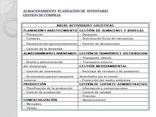 El proceso de almacenamiento, la planeación de inventarios y la gestión de compras se integran para cumplir objetivos de aprovisionamiento o suministro mediante los cuales la empresa se provee de los materiales necesarios para su funcionamiento. Estos procesos buscan optimizar espacios, tiempos y costos para garantizar la calidad de los productos al satisfacer la demanda mediante inventarios adecuadamente controlados.
