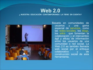 Este documento describe varias herramientas web 2.0 como blogs, wikis, redes sociales y audioforos y cómo pueden usarse en el aula para mejorar la educación. Explica que los blogs permiten compartir conocimientos, los wikis fomentan la colaboración estudiantil, y las redes sociales y audioforos estimulan la discusión y retroalimentación entre estudiantes.