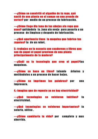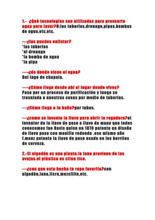 El documento describe varios procesos tecnológicos relacionados con el suministro de agua, la fabricación de ropa y papel, y la impresión de libros. El agua proviene del Lago de Chapala y llega a las casas a través de tuberías después de un proceso de purificación. La ropa se fabrica a partir de materiales como algodón, lana y licra mediante procesos industriales. El papel se produce a partir de la madera y los libros se imprimen usando impresoras.