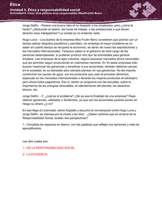 Este documento presenta una conversación entre Hugo Luna y Jorge Delfín sobre la situación de la empresa Mex Fruitin Bono, una empresa de alimentos procesados que se ha visto afectada por la crisis económica. Hugo explica que la empresa se ha visto obligada a despedir empleados debido a la caída de las exportaciones. Más tarde, el Licenciado Jaime Argüello introduce el tema de la responsabilidad social empresarial y sus diferentes perspectivas.