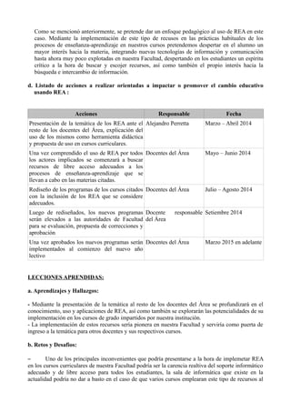 El documento describe un plan para implementar el uso de Recursos Educativos Abiertos (REA) en cursos de Acuicultura y Patología de Organismos Acuáticos en la Universidad de la República en Uruguay. El plan incluye sensibilizar a los estudiantes y docentes sobre los REA, rediseñar los programas de los cursos para incorporar REA, y promover que los estudiantes produzcan y compartan sus propios recursos educativos.