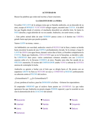 Un esclavo llamado Androcles escapó al bosque y encontró refugio en una cueva donde curó la herida de un león. Más tarde, cuando Androcles fue llevado al circo para luchar contra el león, este lo reconoció y lo saludó cariñosamente. Como resultado, el emperador perdonó la vida de Androcles y lo liberó.