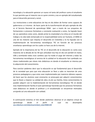 El documento discute la importancia de las tecnologías de la información y la comunicación (TIC) en el desarrollo de la educación. Explica que las TIC permiten métodos de enseñanza más didácticos e interesantes para los estudiantes, facilitando el autoaprendizaje. También señala que las TIC pueden motivar a maestros y estudiantes al modernizar las clases tradicionales. Finalmente, concluye que una educación de calidad que implemente las TIC es fundamental para el progreso de la sociedad.