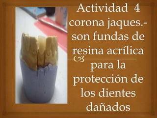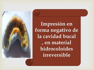 Este documento describe los pasos del proceso de fabricación de una prótesis dental, incluyendo la impresión de la cavidad bucal, el troquelado de la réplica, el encerado para formar la corona, el aislado y lavado de la réplica, el acrilizado para dar forma y color a la prótesis, el pulido y acabado final. El proceso tiene como objetivo crear una prótesis dental funcional y estéticamente adecuada.