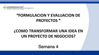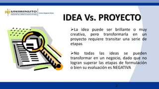 El documento describe las etapas para transformar una idea en un proyecto de negocios. Explica que una idea puede no ser viable para un negocio y debe pasar por etapas de formulación y evaluación. Detalla las etapas clave de la formulación de un proyecto: 1) estudio de mercado, 2) determinación del tamaño y ubicación, 3) ingeniería del proyecto, 4) cálculo de costos, ingresos e inversiones, y 5) organización. El estudio de mercado es fundamental para determinar la demanda y características del