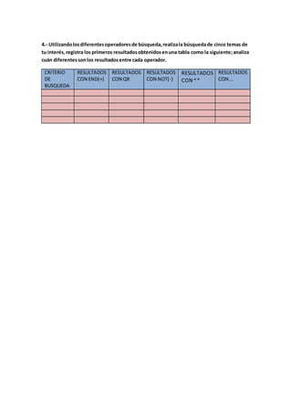 Este documento presenta instrucciones para una tarea de investigación sobre métodos de búsqueda de información en Internet. Los estudiantes deben completar una tabla con los nombres y direcciones de varios motores de búsqueda populares, crear un mapa conceptual sobre diferentes métodos de búsqueda, y realizar búsquedas de temas de su interés usando diferentes operadores lógicos para analizar cómo varían los resultados.