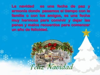 El documento habla sobre las razones por las cuales es importante celebrar la Navidad en familia. Menciona que diciembre es un mes para vivir en familia, celebrar las tradiciones, y ser más amables. También es un tiempo para las vacaciones, la comida, y la esperanza de poder abrazar a los seres queridos, ya que diciembre es un mes mágico dedicado a la reflexión, los sueños, el amor y la armonía.