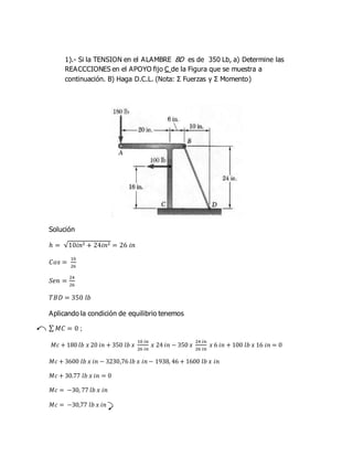 El primer documento presenta un problema de estatica con una viga con apoyos fijos y una carga. Se calculan las reacciones en el apoyo fijo y la tensión en el alambre. El segundo documento analiza una caja sostenida por una grúa, calculando la tensión en el cable y las reacciones en los apoyos. El tercer documento resuelve un problema de estatica de una viga con dos apoyos y dos cargas, determinando las reacciones en los apoyos.