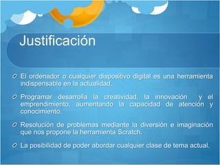 Este documento presenta un plan de programación para estudiantes utilizando Scratch. El plan tiene como objetivo desarrollar la creatividad, la resolución de problemas y las habilidades de comunicación de los estudiantes a través de la creación de proyectos de programación. Los estudiantes aprenderán conceptos básicos de programación y crearán juegos y presentaciones interactivas que publicarán en la comunidad Scratch para recibir comentarios.