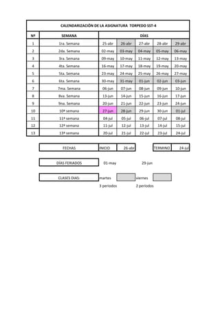 El documento presenta el cronograma de una asignatura sobre torpedos SST-4. La asignatura se divide en 13 semanas con temas, contenidos conceptuales y evaluaciones. Cada semana incluye 1-3 días de clase con temas como secciones del torpedo, desarmado de partes, pruebas de calibración y mantenimiento, y precauciones de seguridad. El cronograma detalla las fechas de inicio y término de la asignatura, así como los días de clase y evaluaciones programadas.