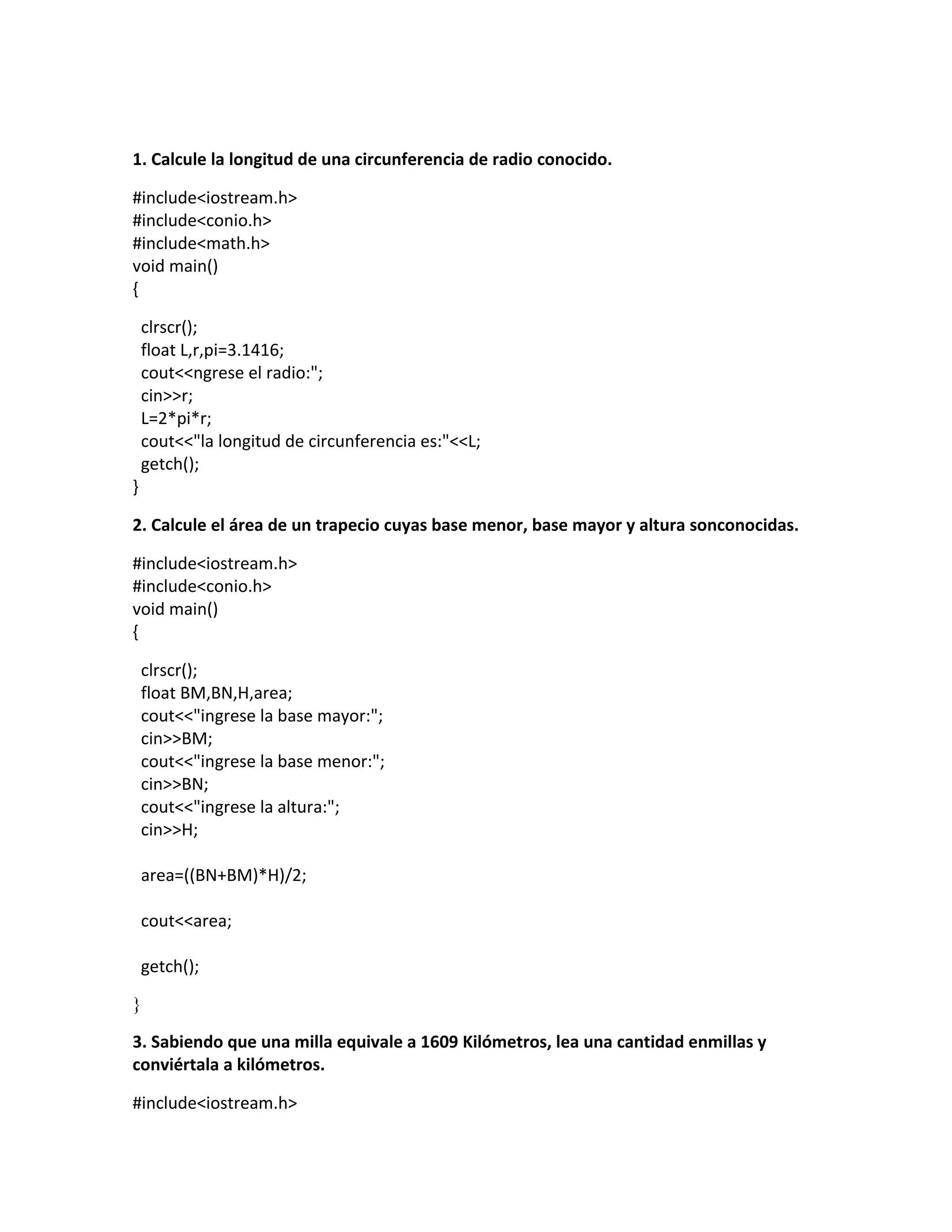 Este documento contiene ejemplos de código en C++ para la resolución de diferentes problemas matemáticos. Presenta 5 ejemplos que calculan la longitud de una circunferencia, el área de un trapecio, la conversión de millas a kilómetros, el perímetro de un rectángulo y de un triángulo rectángulo. Luego, muestra 5 ejercicios con condicionales que determinan si un número es primo, par o impar, identifican el día de la semana o mes correspondiente a un número, y definen si un número es posit