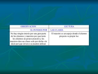 El documento habla sobre las relaciones entre alumnos y maestros. Señala que los estudiantes normalistas deben reconocer las diversas formas en que se establecen las relaciones entre adolescentes y maestros, tomando en cuenta aspectos como las actividades de enseñanza, el ambiente de trabajo y el interés de los alumnos por la clase.
