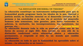 El documento presenta el programa de capacitación complementaria para docentes de 2016 de la Comisión Internacional sobre la Educación del Siglo XXI de la UNESCO. El programa cubre temas como la sociedad mundial, la cohesión social, el desarrollo humano, los pilares de la educación, la educación a lo largo de la vida, la educación básica a universitaria, el personal docente y el papel de los políticos en la educación. El objetivo final es lograr una educación que permita a la humanidad dirigir su propio desarrollo
