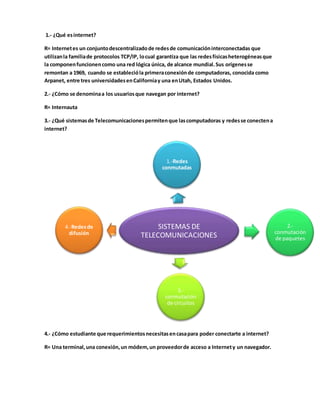 El documento describe los orígenes e historia de Internet. Comenzó en 1969 como una red de computadoras del gobierno de Estados Unidos llamada ARPANET, la cual se expandió a nivel mundial en la década de 1980 y estableció el protocolo TCP/IP. En la década de 1990 surgieron aplicaciones como el World Wide Web que permitieron que Internet se popularizara entre millones de usuarios.