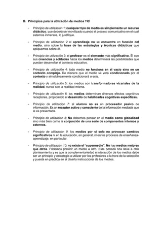 El documento presenta 11 principios para la selección de medios TIC y 10 principios para su utilización. Los principios de selección incluyen considerar los objetivos educativos, las características de los estudiantes, el contexto instructivo y facilitar la participación activa de los estudiantes. Los principios de utilización enfatizan que el aprendizaje depende de las estrategias didácticas más que del medio en sí, la importancia del papel del profesor y la necesidad de combinar diferentes medios.