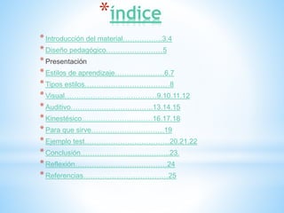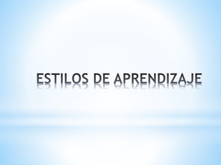 El documento presenta un material educativo sobre los estilos de aprendizaje basados en el modelo VAK (visual, auditivo y kinestésico), enfatizando la importancia de adaptar la enseñanza a las preferencias individuales de los alumnos. Se describen las características de cada estilo y se proporcionan estrategias pedagógicas para facilitar el aprendizaje. Se concluye que la identificación y aplicación de diversos estilos de representación puede mejorar el rendimiento y la comprensión de los estudiantes en el aula.