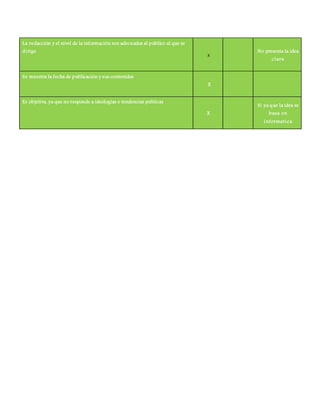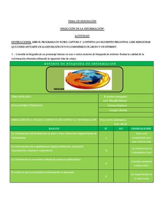 Este documento presenta una actividad sobre la selección de información en la que los estudiantes deben buscar la biografía de un personaje famoso usando motores de búsqueda. Luego deben evaluar la calidad de la información encontrada usando una lista de verificación que incluye criterios como si la información está firmada por un autor o hace referencia a una fuente, si está respaldada por una institución, si contiene publicidad, y si la redacción y organización son adecuadas. Finalmente, los estudiantes deben reportar los resultados de