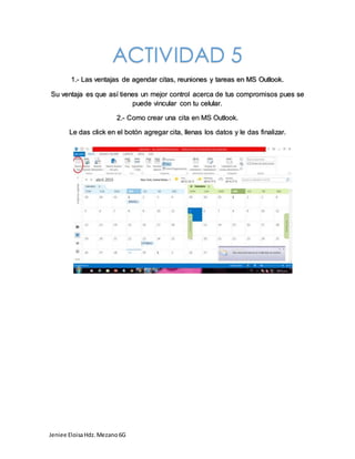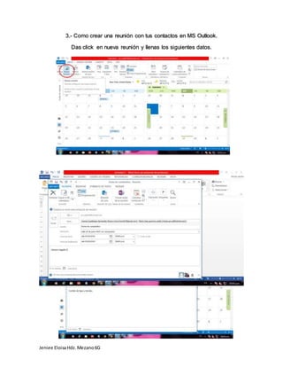 Las ventajas de agendar citas, reuniones y tareas en MS Outlook incluyen tener un mejor control de los compromisos ya que se puede vincular con el celular. Para crear una cita en MS Outlook se da click en agregar cita, se llenan los datos requeridos y se da click en finalizar. Para crear una reunión con contactos en MS Outlook se da click en nueva reunión y se llenan los datos solicitados como fecha, hora, participantes y detalles de la reunión.