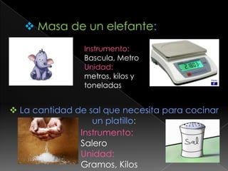 Este documento lista varias cantidades y volúmenes comunes junto con los instrumentos y unidades de medida apropiados para cada uno, incluyendo la masa de un elefante (bascula, metro, kilos, toneladas), la cantidad de sal para cocinar (salero, gramos, kilos), la masa de una persona (bascula, metro, kilos), y el volumen de agua de una alberca (metro, metro, cm2).