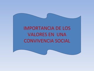 Este documento describe la importancia de los valores para la convivencia social. Explica que los valores buscan perfeccionar al ser humano para que se sienta feliz a través de valores como los biológicos, sensibles, económicos, estéticos, intelectuales y religiosos. También menciona las virtudes de la prudencia, justicia, fortaleza y templanza, y cómo la ruptura de valores puede conducir a comportamientos inadecuados en la sociedad.