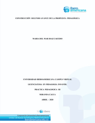 Este documento presenta información sobre la propuesta pedagógica de María del Mar Díaz Caicedo para su práctica pedagógica en el hogar comunitario Alely en Miranda, Cauca. Expone el marco teórico y conceptual que incluye las concepciones de educación preescolar, la práctica pedagógica, y los lineamientos nacionales. También describe la metodología propuesta que se centra en proyectos lúdicos pedagógicos, actividades con sentido y evaluación cualitativa para contribuir al des