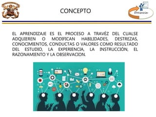 El documento describe diferentes tipos y factores del aprendizaje. Define el aprendizaje como un proceso a través del cual se adquieren o modifican habilidades a través del estudio, experiencia e instrucción. Explica que el aprendizaje se ve influenciado por factores cognitivos como la inteligencia y memoria, y factores socioafectivos como la motivación y grupos sociales. También describe tipos de aprendizaje como repetitivo, receptivo, por descubrimiento, de mantenimiento, visual, observacional y auditivo.