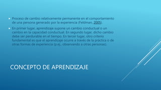 El documento describe diferentes conceptos y teorías sobre el aprendizaje. Define el aprendizaje como un proceso de cambio en el comportamiento de una persona generado por la experiencia. Explica que el aprendizaje implica un cambio conductual duradero que ocurre a través de la práctica o observación. También describe los factores que intervienen en el aprendizaje como la inteligencia, conocimientos previos, experiencia y motivación. Finalmente, resume diferentes teorías sobre el aprendizaje como las teorías conductistas, cognitivas y del proces
