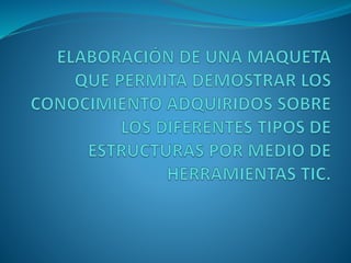 Las estructuras sirven para soportar peso, salvar distancias, proteger objetos o dar rigidez a elementos. Existen diferentes tipos de estructuras como pilares, vigas, muros y tirantes. Las estructuras pueden ser naturales, artificiales, móviles o fijas. El documento propone construir un puente de arco con papel para ilustrar el uso de las estructuras.