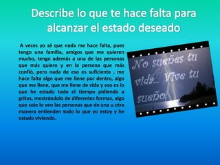 Este documento describe los sueños y aspiraciones de Vanessa Villa Coronado. Ella desea ser campeona mundial de natación con aletas y quiere que la música sea una gran parte de su vida. También busca ser escuchada por su familia y depositar su confianza en ellos.