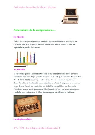 El documento describe la historia de los antecedentes de la computadora, incluyendo el ábaco, la Pascalina inventada por Blaise Pascal, y la máquina analítica de Charles Babbage, que tenía características similares a las computadoras modernas. También menciona los primeros ordenadores analógicos del siglo XX y el desarrollo de los circuitos integrados en la década de 1960, que permitieron reducir el tamaño y costo de las computadoras.