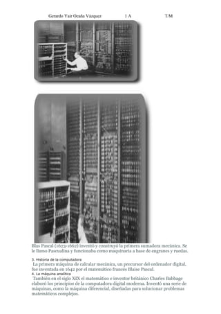 El documento resume los orígenes de la computadora, comenzando con el ábaco hace 5000 años. Luego describe algunas de las primeras máquinas de calcular mecánicas como la Pascualina de Blaise Pascal en 1642 y la máquina analítica de Charles Babbage en el siglo XIX. Finalmente, menciona a algunos pioneros de la computación como Atanasoff y Berry y cómo se desarrollaron los primeros ordenadores analógicos y digitales a principios del siglo XX.