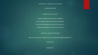 El documento explora las leyes de la Gestalt que rigen la percepción visual, describiendo cómo el cerebro organiza y agrupa elementos a través de principios como la proximidad, continuidad y figura-fondo. Incluye ejemplos de ilusiones ópticas para ilustrar cómo distintas interpretaciones visuales pueden surgir según la organización de los elementos. La Gestalt es clave en distintas disciplinas, ya que ayuda a entender la forma en que experimentamos nuestro entorno visual.