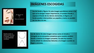 El documento resume las leyes de la Gestalt como principios de organización visual. Explica la Ley de Figura y Fondo, en la que se le otorga mayor importancia a ciertas zonas. También describe la Ley de Cierre, en la que el cerebro completa formas incompletas. Finalmente, resume la Ley de Simplicidad, en la que se perciben las formas más simples en una imagen.