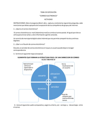 El documento habla sobre el correo electrónico y proveedores de correo. Explica que el correo electrónico permite compartir texto y archivos digitales de forma similar al correo postal. Describe los elementos que componen una dirección de correo como el usuario, dominio y servidor. También compara ventajas y desventajas del correo tradicional versus electrónico y analiza proveedores de correo gratuitos y de pago.