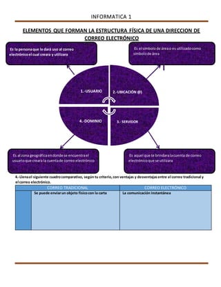 Este documento proporciona instrucciones para completar una tarea sobre correo electrónico. Incluye preguntas sobre qué es el correo electrónico, los buzones de correo, los elementos de una dirección de correo como el usuario, ubicación y dominio, y comparaciones entre correo tradicional y electrónico. También cubre proveedores de correo gratuitos y de pago, y características de contraseñas seguras.