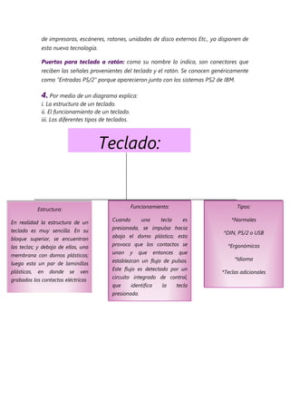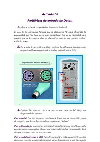 Este documento describe diferentes periféricos de entrada y salida de datos para una computadora personal. Explica los puertos seriales, paralelos y USB, así como puertos para teclado, ratón, escáneres y cámaras digitales. También cubre el funcionamiento y tipos de teclados, ratones, escáneres y cámaras digitales. Recomienda considerar la resolución, calidad óptica, conexión, visor y almacenamiento al comprar una cámara digital. Además, menciona periféricos ad