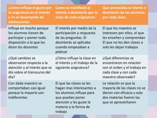 El documento resume las observaciones de un estudiante sobre las actitudes y opiniones de los adolescentes en diferentes asignaturas. El estudiante notó que los adolescentes participaban activamente en matemáticas y física pero preferían hablar en historia. Los adolescentes opinaron que los maestros solo dejaban trabajo y se iban del salón. El interés o desinterés en una asignatura influye en el desempeño y depende de si los maestros se interesan por los estudiantes y les enseñan de manera comprensible. La mayoría de las clases no