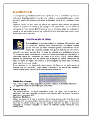 El documento habla sobre la seguridad pública y privada. La seguridad pública es un servicio estatal que busca garantizar la integridad física de los ciudadanos y sus bienes mediante fuerzas de seguridad que previenen y persiguen delitos. La seguridad privada también existe. El documento también explica métodos de encriptación como algoritmos hash, simétricos y asimétricos para proteger la información.