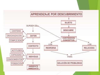 El documento presenta diferentes definiciones de aprendizaje desde las perspectivas conductista y cognitiva. También describe factores que influyen en el aprendizaje como la motivación, el autoconcepto, las representaciones mutuas, las expectativas, las atribuciones causales y los conocimientos previos. Finalmente, introduce diferentes tipos de aprendizaje como el significativo, el descubrimiento, la observación y el repetitivo.