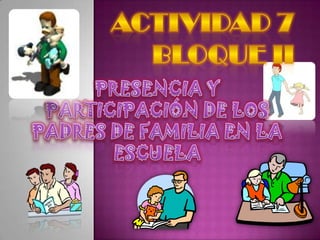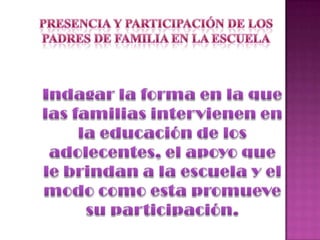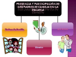 El documento describe las actitudes de los padres de familia, maestros y alumnos hacia la educación. Los padres apoyan activamente a sus hijos en la escuela por amor y no por obligación, asistiendo a actividades y cooperando en lo que sea necesario. Sin embargo, algunos maestros no muestran una actitud positiva y carecen de paciencia e interés. Aun así, los alumnos se sienten protegidos y apoyados por la participación de sus padres.