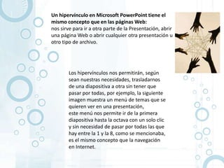 Los hipervínculos en PowerPoint permiten navegar entre diapositivas u otros archivos de manera rápida sin tener que pasar por todas las diapositivas intermedias. Se pueden crear hipervínculos a otras diapositivas, páginas web, correos electrónicos u otros archivos. También es posible modificar o eliminar hipervínculos existentes.